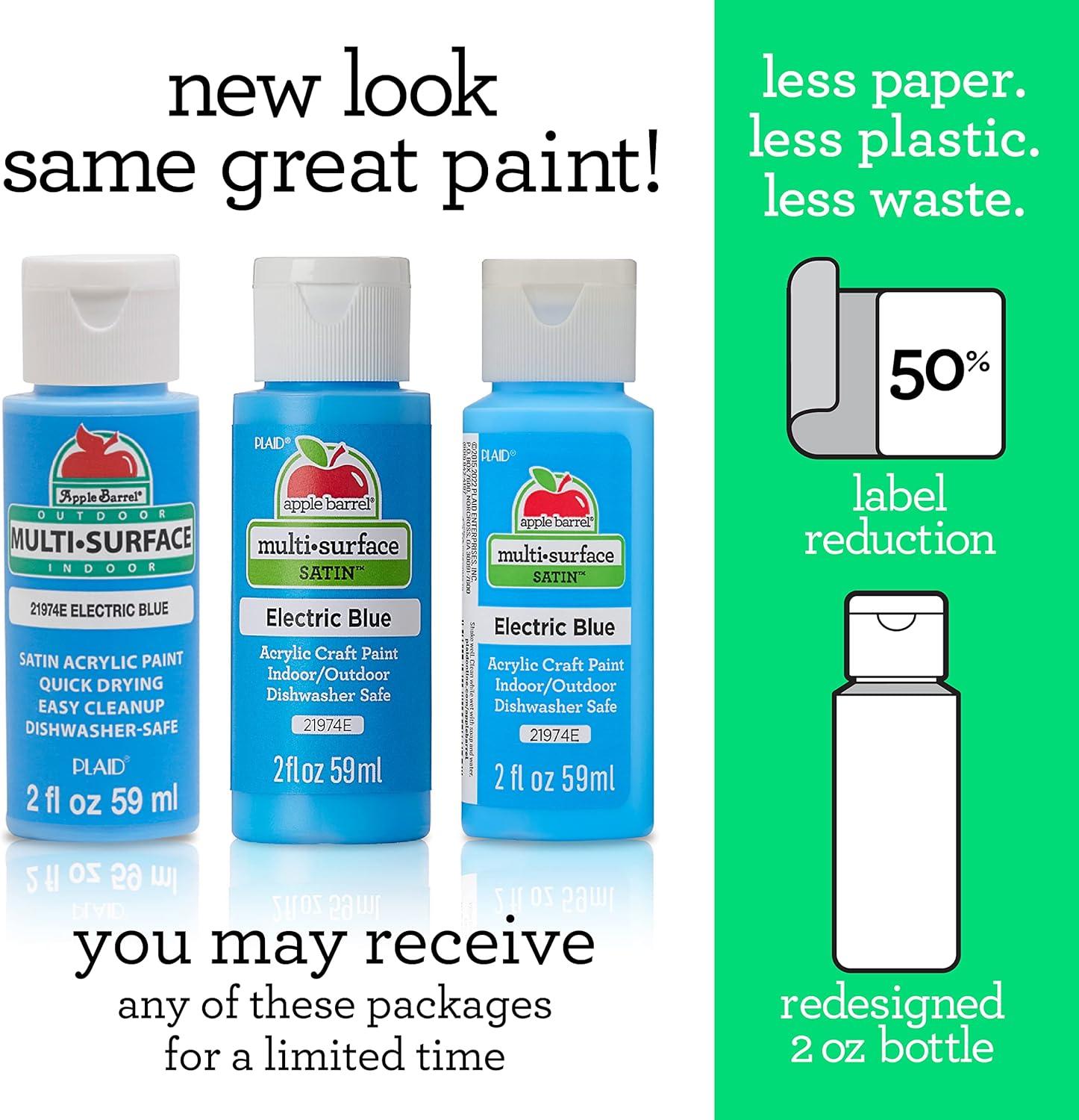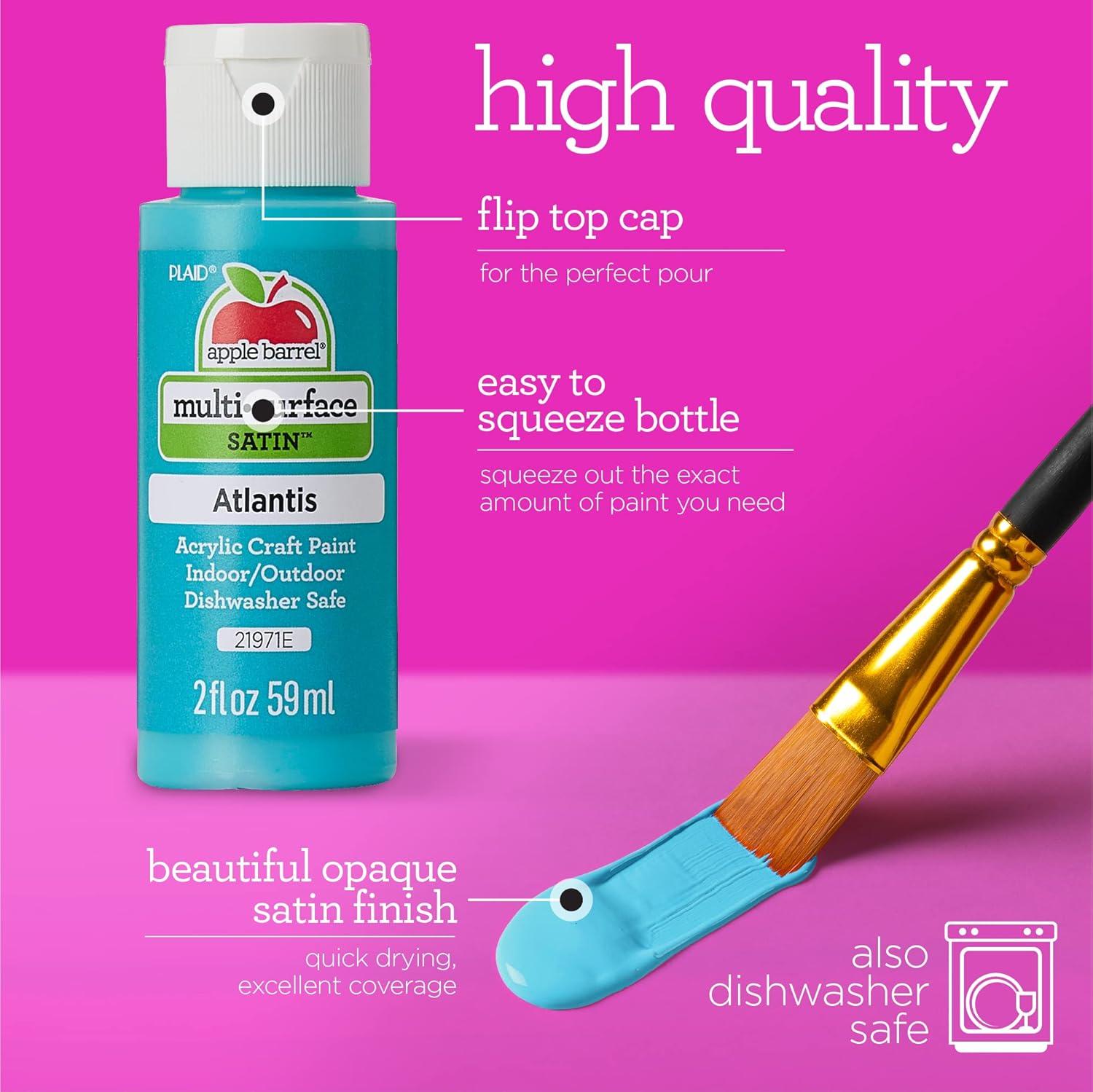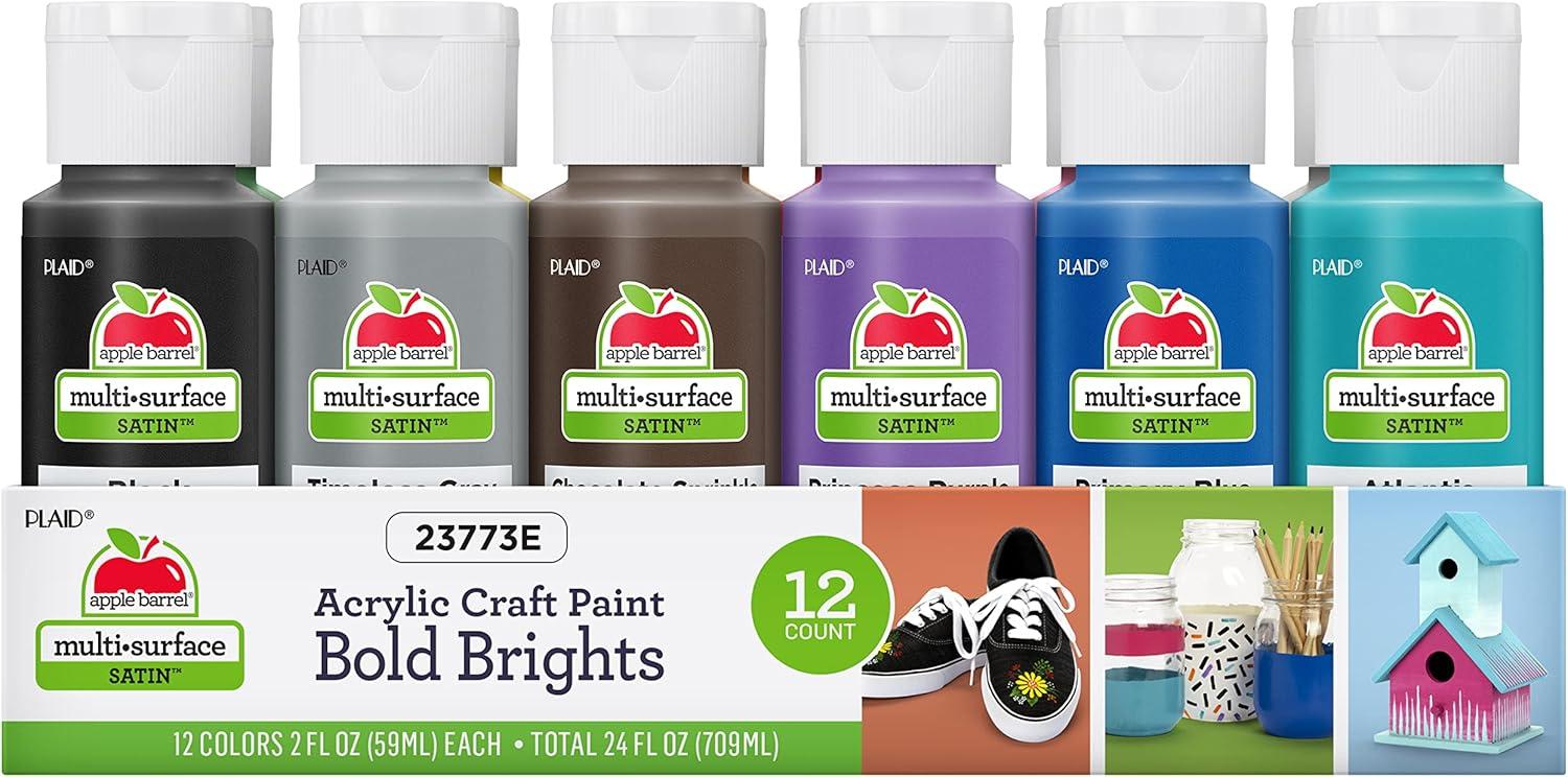 VERSATILE, CONVENIENT ACRYLIC PAINT KIT – This multi-surface acrylic paint set includes 12 – 2 oz bottles of acrylic craft paint. The colors in this set include: Apple Barrel Multi-Surface Outrageous Orange, Black, Princess Purple, Chocolate Sprinkle, Primary Blue, White, Atlantis, Candy Apple, Timeless Gray, Paradise Pink, Lemon, and Clover Fields